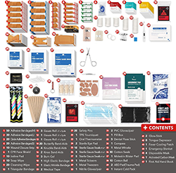 Composants complets : Soins des plaies : pansements, compresses de gaze, ruban adhésif, lingettes antiseptiques