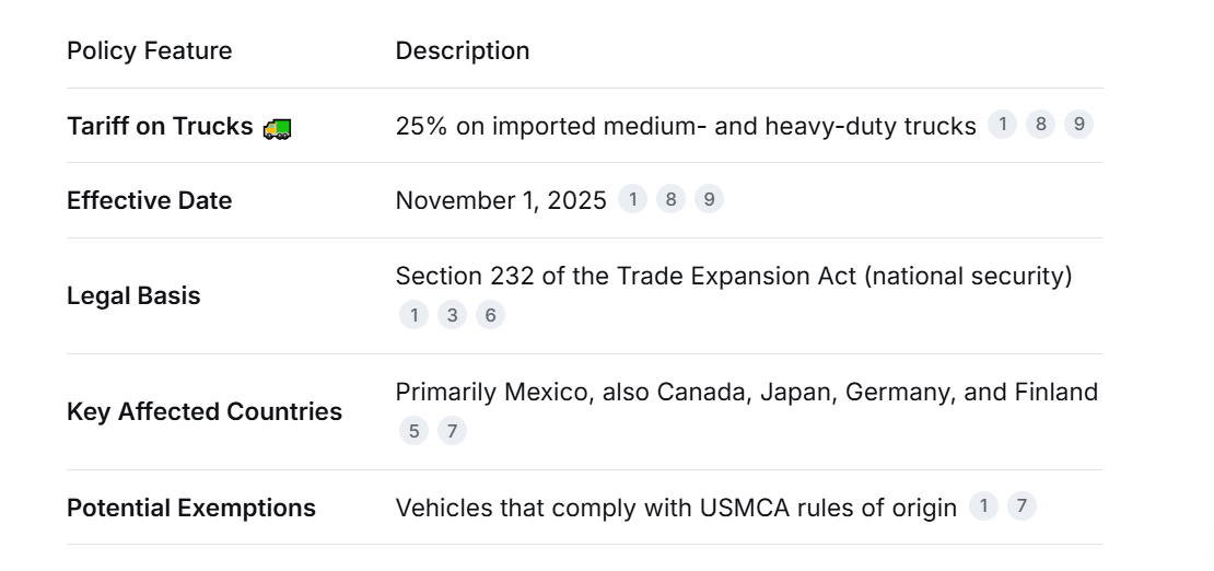 1. Justification de la politique : Ce tarif est basé sur une enquête en vertu de l'article 232 lancée en avril 2025, qui a conclu que la dépendance à l'égard des camions importés menace la sécurité nationale des États-Unis et la chaîne logistique nationale. L'objectif est de protéger les fabricants et les emplois américains.